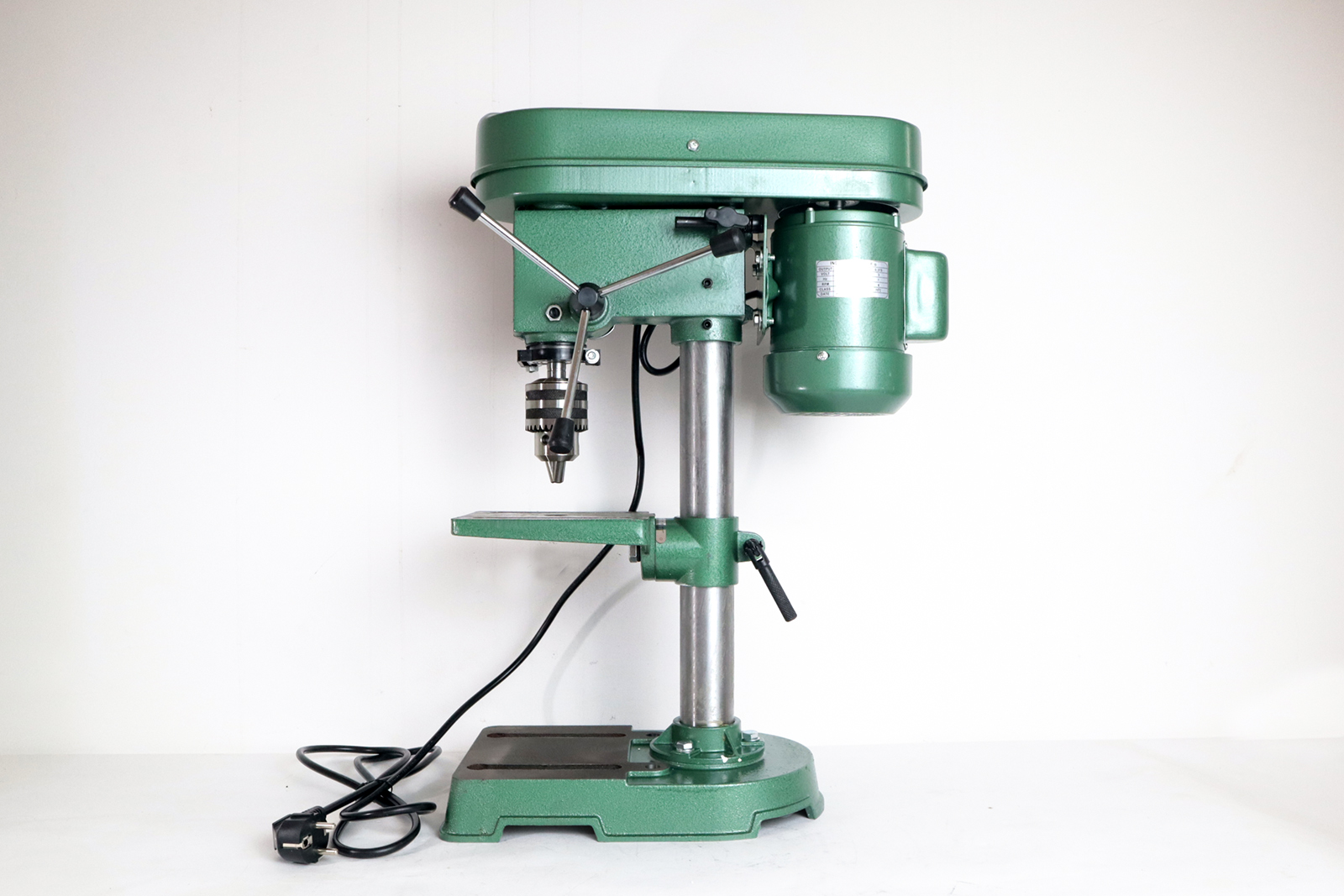 Kích thước máy gọn gàng 450 x 355 x 225mm, chân đế vững chắc. Bàn khoan dạng hình vuông, chỉnh được cao thấp.